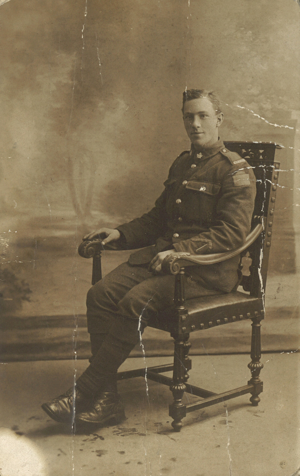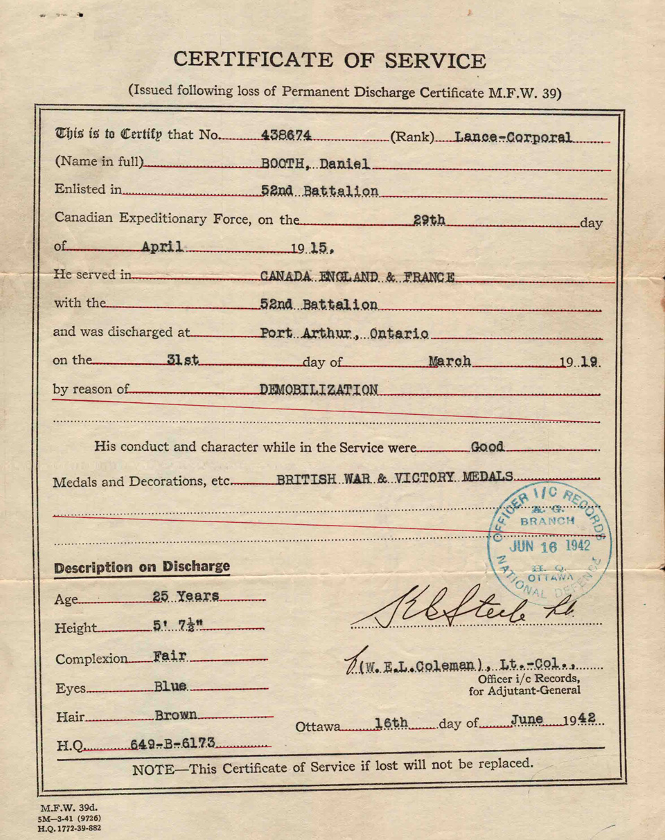 Daniel Edmond Booth enlisted in the 52nd Battalion on April 29, 1915, and served in England and in France. Born on August 23, 1892 in Boston, he was the second oldest of ten children born to James Henry Booth, of Halifax and Annie Bridget (nee MacKinnon) of Boularderie, Cape Breton. Booth was raised in North Sydney, Nova Scotia. His father was a well-known architect. Booth survived the war, but unfortunately was killed in an industrial accident in New York City on April 29, 1949.